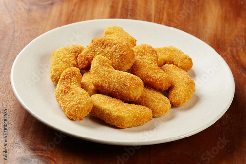 A portion of chicken nuggets served in a white plate on a wooden table background