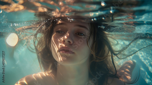 a portrait emerges of a girl submerged in weightless tranquility, her hair billowing like tendrils of liquid silk, surrounded by refracted rays of sunlight