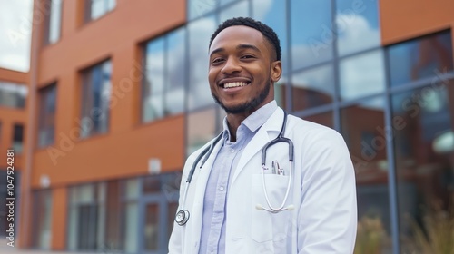 A portrait of a confident doctor smiling outdoors, wearing a white coat with a stethoscope, standing in front of a modern hospital building, symbolizing hope and care