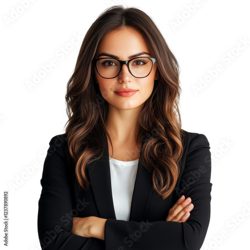 A portrait of a confident young businesswoman wearing glasses and a black blazer with her arms crossed.