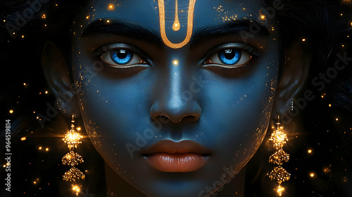 divine, portrait, blue, skin, eye, jewellery, glowing, beauty, culture, art, spirituality, expression, elegance, light, decoration, mystique, tradition, symbolism, face, feature, gaze, feminine, enchanting, serene, radiance, creativity, fantasy, design, aesthetic, ornament, inspiration, mythology, representation, allure, detail, make-up, background, harmony, charme, identity, grace, artistry, visual, emotion, character, uniqueness