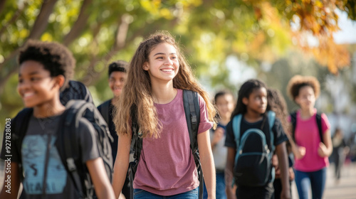 student, group, walking, school, portrait, together, backpack, smiling, conversation, diverse, casual attire, friends, education, happy, energetic, camaraderie, morning, classmate, friendship, young people, back to school, academic, positive, cheerful, youth, engaged, interaction, friendly, casual attire