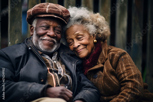 A portrait of a lovely old couple in warm coats and hats snuggling and spending time together at the park in autumn. Generative AI.