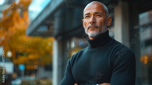 man, urban, setting, portrait, thoughtful, expression, city, city landscape, street, building, standing, looking, distance, arm, crossed, beard, grey, hair, black, shirt, turtleneck, clothing, fashion, style, mood, pensive, contemplative, serious, mature, confident, cool, calm, collected, pose, day, daylight, background, sharpened, photo