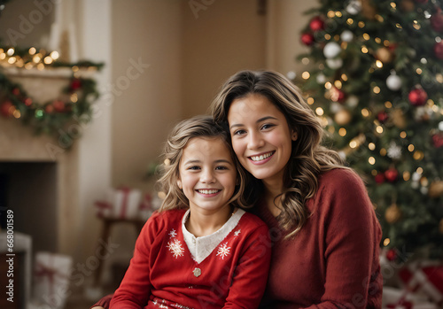 A portrait of a mother and her child bathed in the warm glow of Christmas decorations, share a joyous moment of happiness and contentment.