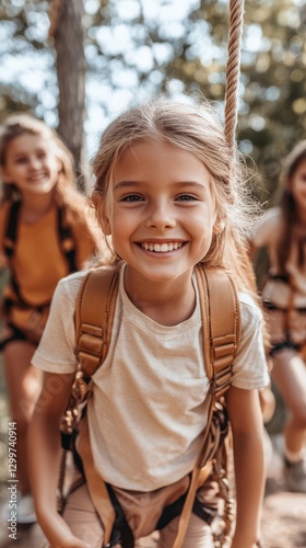girl, smiling, adventure, friends, rope, course, forest, happy, playful, youth, activity, nature, fun, children, exploration, bright, climbing, team, joyful, sunlight, breeze, camaraderie, harness, play, explore, thrill, swing, companion, excitement, energy, childhood, enjoyment, outdoors, happiness, timeless