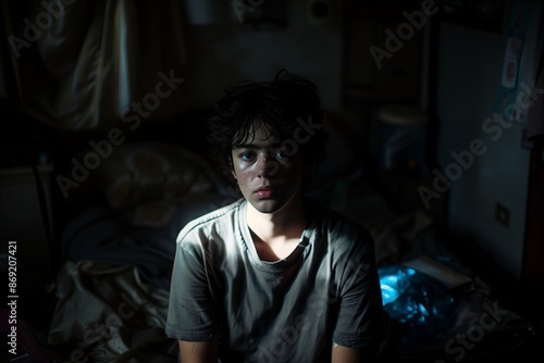 A portrait of a young person sitting alone in a dimly lit room, showing a deep sense of sadness and