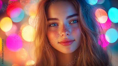 A portrait of a young woman with long hair and blue eyes, smiling softly while gazing directly at the camera amidst a blurred background featuring vibrant neon lights.