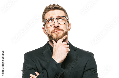 A portrait of an adult man in glasses, with short hair and a beard, wearing formal , is thinking about something isolated on a white background.