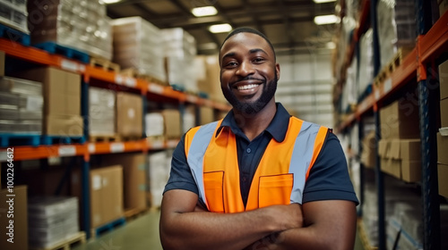 A portrait of an African American warehouse worker, smiling and standing with his arms crossed in front of shelves filled with goods.