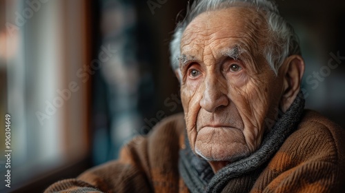 A portrait of an elderly man with a thoughtful expression, looking off-camera. His face shows the signs of a long life. He is wearing a brown sweater.