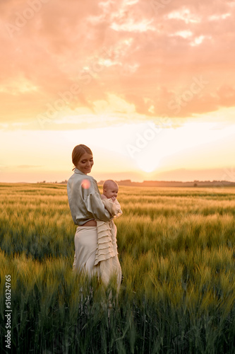A portrait of young mother with a baby in her arms at sunset in the field. happy family concept