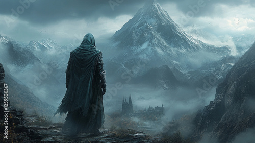 A powerful and mysterious woman warrior knight in an assassin robe stands in the mountains, symbolizing strength, courage, and resilience amidst the chaos of battle and nature's vastness