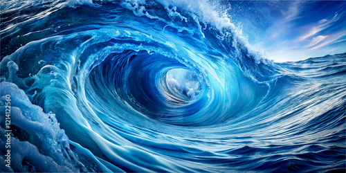 A powerful ocean wave curls dramatically, showcasing vibrant shades of blue and white foam. Sunlight illuminates the water, creating a vivid and energetic atmosphere