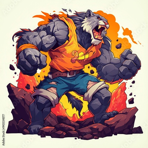 monster, stone, rock, creature, beast, angry, furious, expression, powerful, rage, growl, teeth, fang, claw, muscle, ripped, shirt, tank, top, orange, blue, jean, torn, ground, rock, fire, magma, lava, smoke, cartoon, illustration, digital, art, graphic, design, white, background