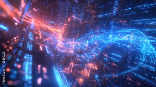 A powerful telecom scene with a sprawling data center, servers glowing in blue, and abstract signal waves connecting devices globally.