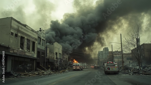 A powerful view of smoke engulfing a city street during a dramatic fire. The thick, dark smoke obscures