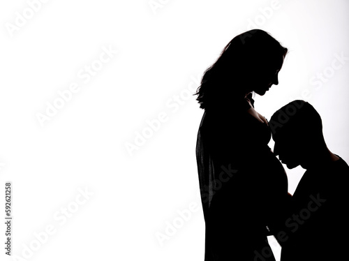a pregnant couple on a white background with black shadows with space for advertising and text in isolation. The shadow of a pregnant couple. Girl and guy