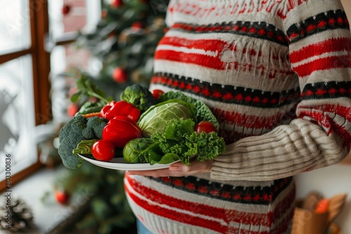 A pregnant woman holding a plate of vegetables, promoting weight control and healthy eating during pregnancy