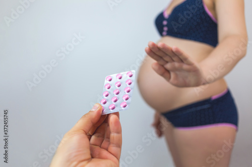 A pregnant woman refuses to take pills. White background
