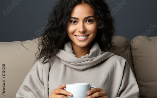 A pretty happy girl sitting on the sofa at home holding a cup of cappuccino in her hands, enjoying and dreaming