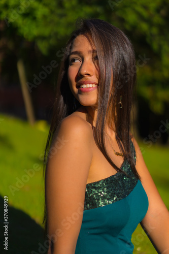 A pretty young brunette Latina with long straight hair, wearing a tight green dress. Smiling portrait of a young girl enjoying a park in summer