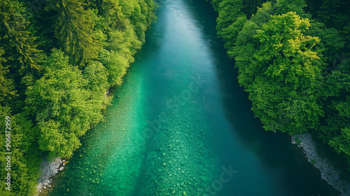 A pristine river with transparent waters meandering through a forest, showcasing the importance of water conservation and the splendor of nature.