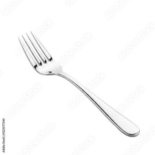 A pristine, sleek, modern stainless steel dessert fork with four tines, perfectly clean, isolated on a seamless transparent reflective background with no shadows, studio shot, high-key lighting,