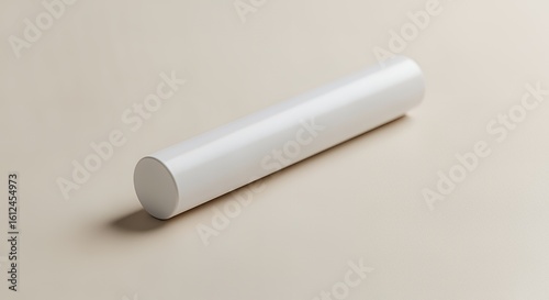 A pristine white cylindrical object rests on a pale beige , casting a subtle shadow.