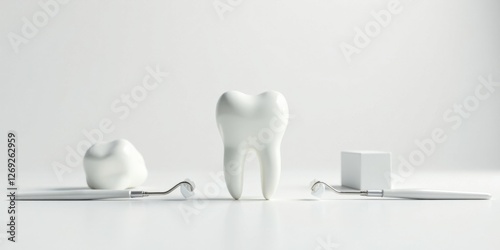 A pristine white molar, dental instruments, and a simple block, arranged against a stark white backdrop, symbolize dental hygiene and oral care