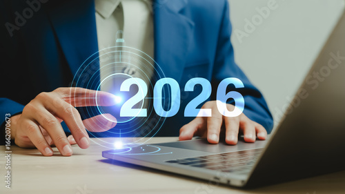 A professional business photo of hands typing on a silver laptop keyboard with a holographic 2026 number floating above the workspace.
