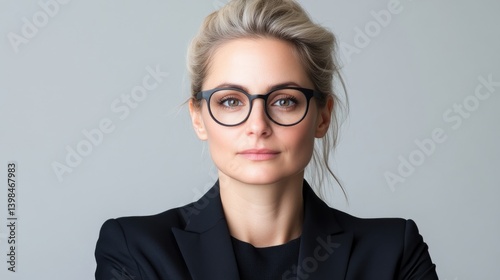 A professional businesswoman wearing glasses looking at the camera, standing in a modern office setting, confident and composed expression, and corporate portrait.
