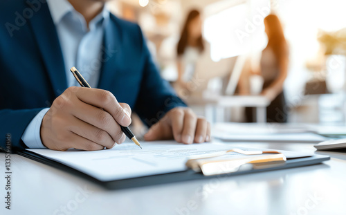 A professional man in a suit writes notes on a clipboard at a busy office, capturing the essence of productivity and teamwork in a modern workplace environment.