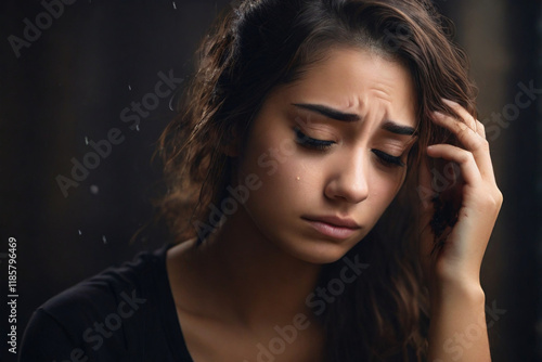 A professional photoshoot of Tearful sorrow, blurry background, and copyspace