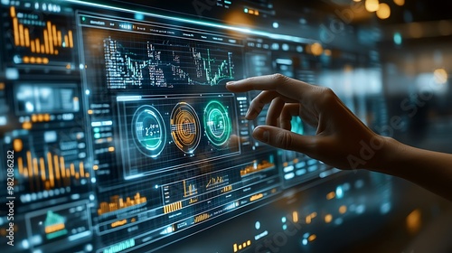 hand, virtual, dashboard, futuristic, graph, global, market, trend, business, tool, neon, blue, green, lighting, sleek, modern, office, reflective, surface, clean, line, workspace, glowing, interactive, projection, professional, corporate, advanced, illuminated, tech, innovative, high technology