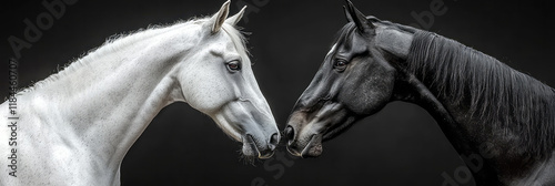 A proud white stallion bending its neck in deference to a sleek black mare, set against a simple gray studio setting,