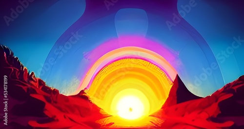 a psychedelic illusion mountain scenery, moody, space, colorful, sun, artstation, digital art