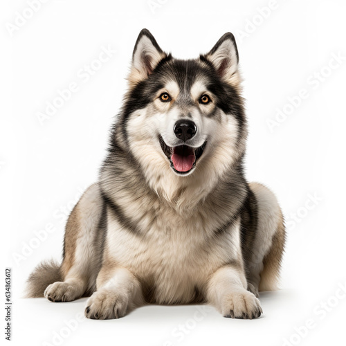 A purebred Alaskan Malamute dog with a happy and smiling facial expression looking forward at the camera. Isolated on white.