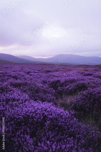 A purple field with mountains in the background. The sky is cloudy and the sun is setting