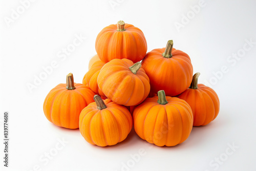 A pyramid of small, bright orange pumpkins arranged on a white background.