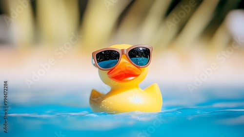 a quacking rubber ducky with sunglasses in a very blue and beautiful pool, summer vibes wallpaper