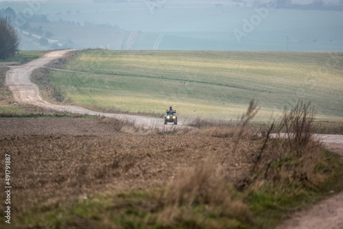a quad biker with lights on riding his off-road quad bike along a stone track open countryside