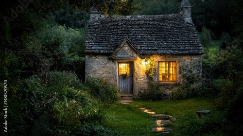 bungalow, stone, house, garden, green, nature, path, grass, light, window, door, roof, tree, leaf, plant, evening, tranquil, calm, peaceful, warm, cosy, illuminated, charming, idylli, rural, exterior, architecture, building, structure, facades, chimney, moss, step, paseo, bush, wooden, old, aged, twilight, dusk, glow, illumination, pathway, small, inviting, secluded, foliage, wild