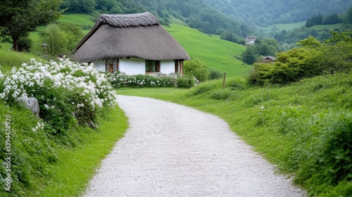 A quaint cottage with a thatched roof nestled in a lush green valley, winding gravel path leading through vibrant wildflowers, and serene countryside scene.