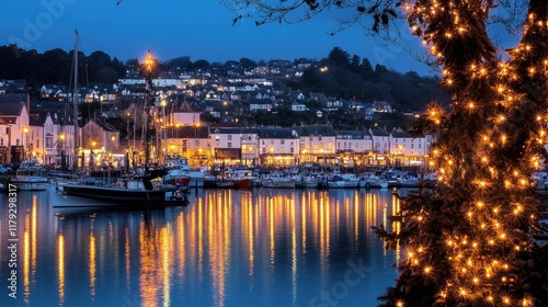 A quiet city harbor with moored boats and twinkling lights reflected on the water.