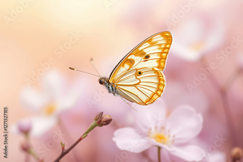 butterfly, gold, flying, pink, flower, nature, insect, delicate, soft, artistic, beauty, macro, garden, wing, warm, elegant, graceful, dreamy, floral, seasonal, light, gentle, symbolic, tender, blurred, summer, vibrant, airy, pastel, background, scenic, closeup, harmony, natural, peaceful, transformation, romantic, bright, blooming