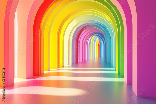 A rainbow-colored illuminated hallway with arches creating a surreal, vibrant tunnel effect. This image is ideal for concepts of diversity, creativity, and positivity.