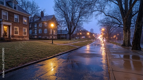 rain, street, light, house, tree, sidewalk, evening, mist, urban, quiet, landscape, path, atmosphere, glow, nature, weather, solitude, city, calmness, architecture, grass, dusk, environment, wet, peaceful, scenery, illumination, fog, neighbourhood, calm, twilight, view, road, serene, shadow, ambience, calmness, beauty, outdoors, rural, community, silence, stillness, visual