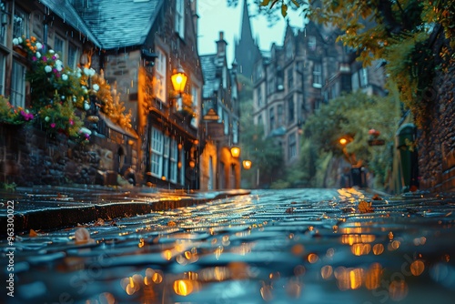 A rainy street with a brick walkway and a few houses