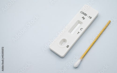 A rapid antigen test pad with short cotton swab on white background. Rapid antigen testing is a screening tool to help detect COVID-19 in people without any symptoms of COVID-19.